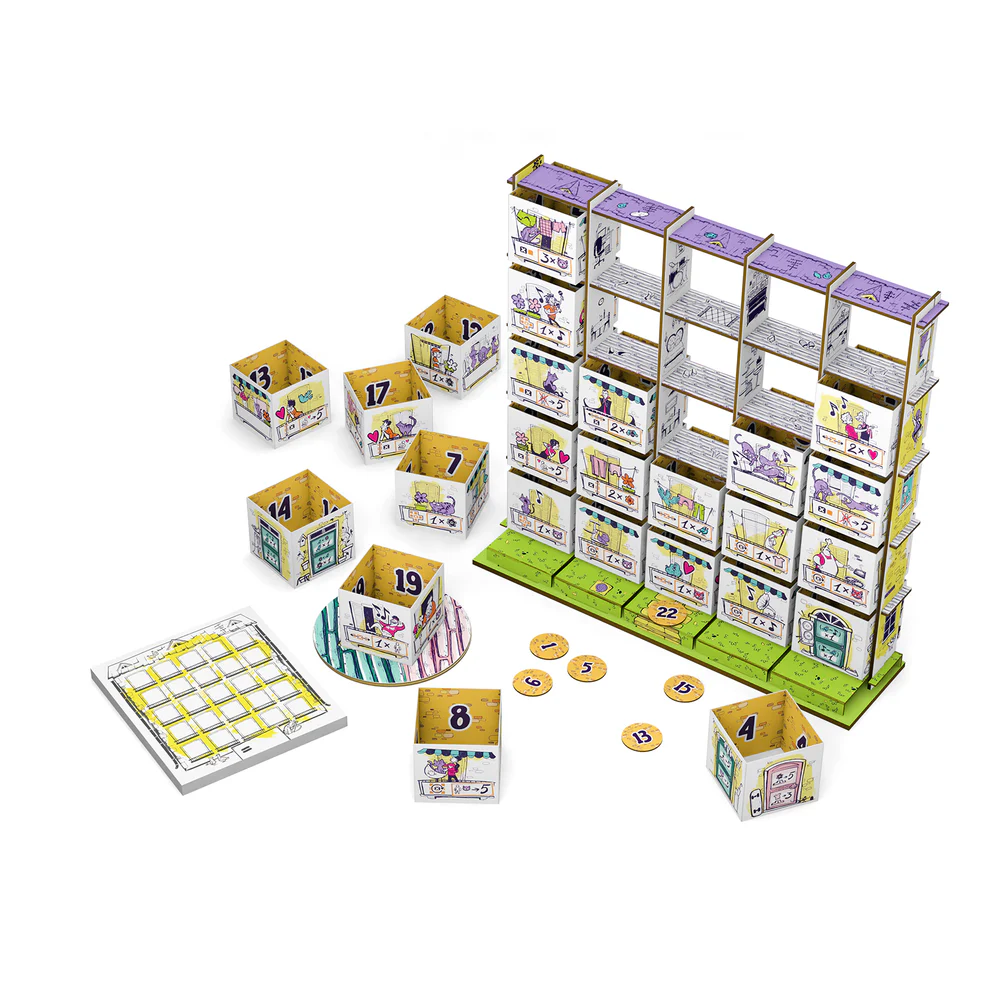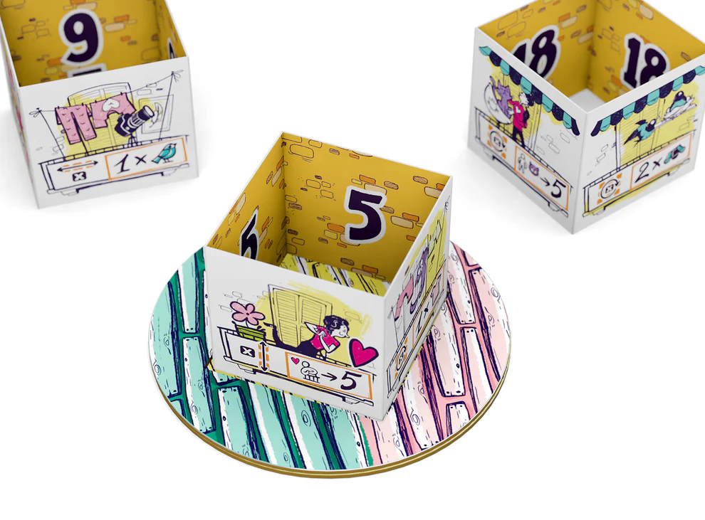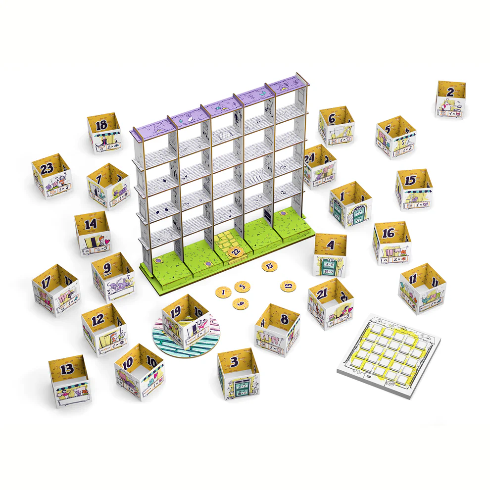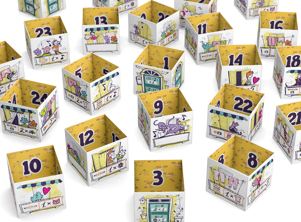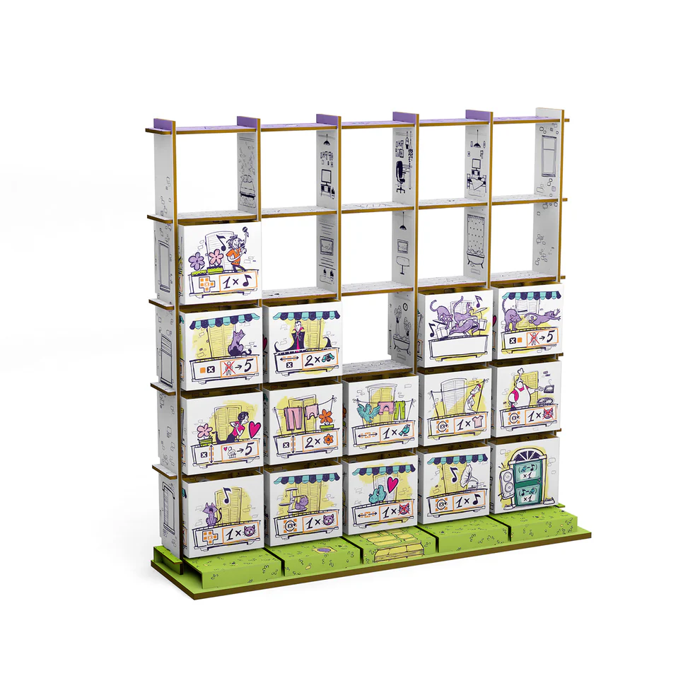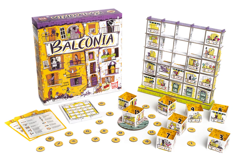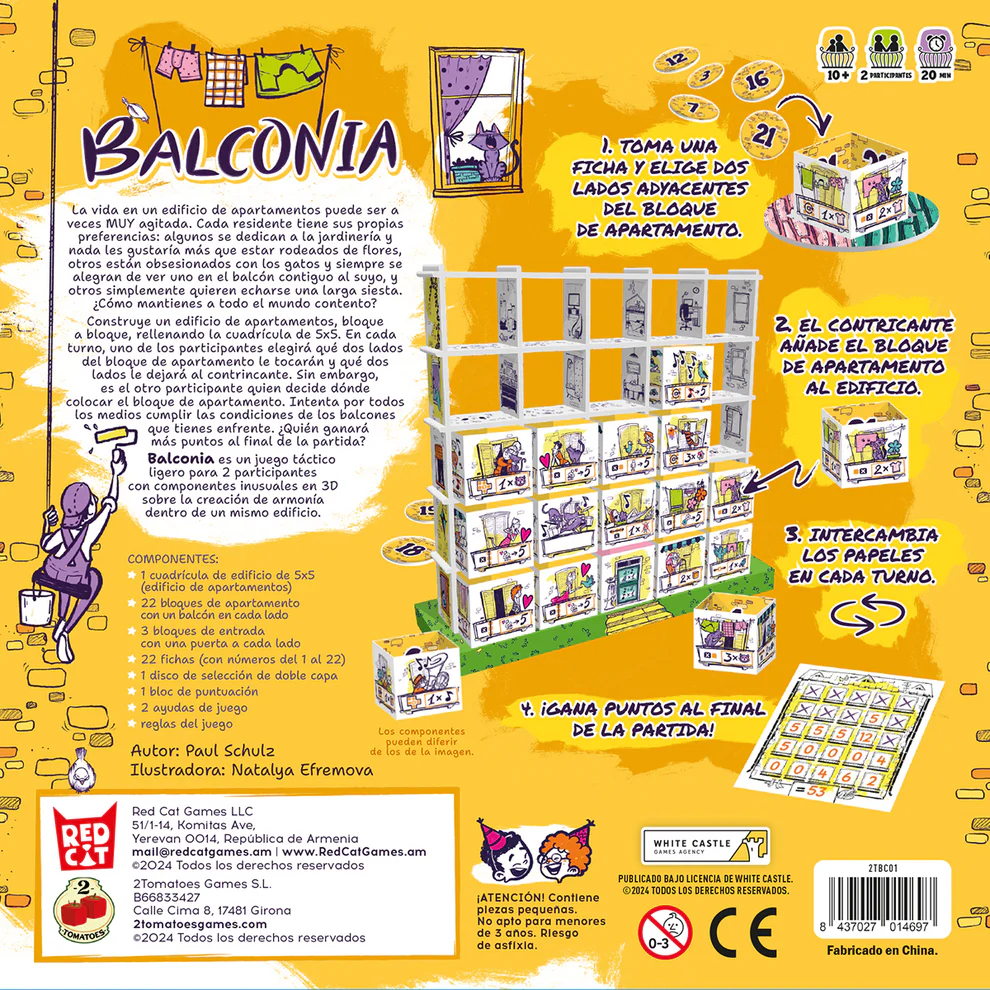 Construye un edificio de apartamentos, bloque a bloque, rellenando la cuadrícula de 5х5. En cada turno, uno de los participantes elegirá qué dos lados del bloque del edificio le tocarán y qué dos lados le dejará al contrincante. Sin embargo, es el otro participante quien decide dónde colocar el bloque de construcción. Intenta por todos los medios cumplir las condiciones de los balcones que tienes enfrente. ¿Quién ganará más puntos al final de la partida? Balconia es un juego táctico ligero para 2 participantes con componentes inusuales en 3D sobre la creación de armonía dentro de un mismo edificio.