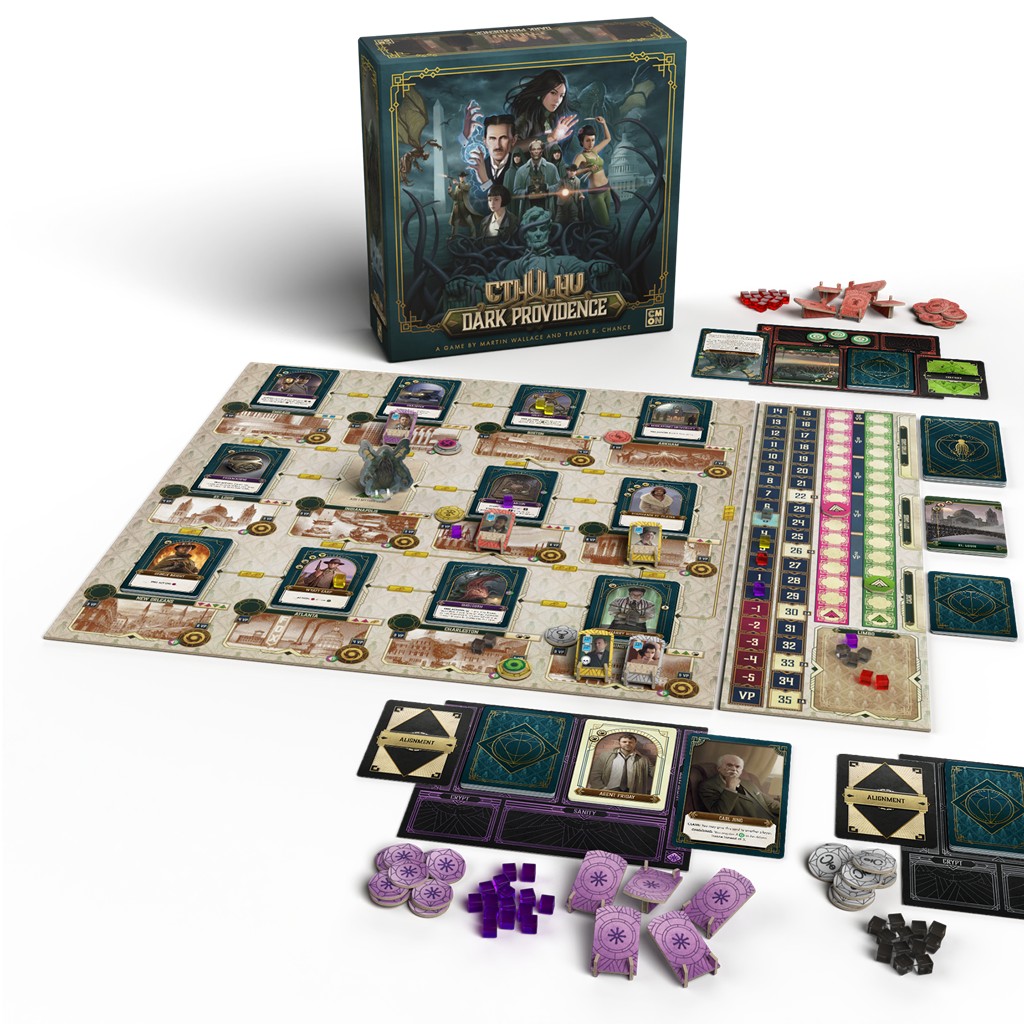 Cthulhu: Dark Providence es un juego de tablero competitivo en el que los jugadores se dividen secretamente en distintos bandos de un conflicto sobre el destino de una nación al borde de la ruina. Los jugadores utilizan su influencia para pujar por el derecho a reclamar bienes, tomar el control de ciudades y conspirar con poderosas entidades de los Mitos. Para mantener la cordura y el secreto, los jugadores realizan diversas acciones, como reclutar agentes, eliminar rivales, bloquear oponentes y sellar o proteger puertas a dimensiones ultraterrenas para avanzar en su agenda y ganar puntos. A pesar de estar divididos en bandos opuestos, ¡sólo el jugador con la mayor puntuación de la facción líder conseguirá la victoria y marcará el destino de la nación!