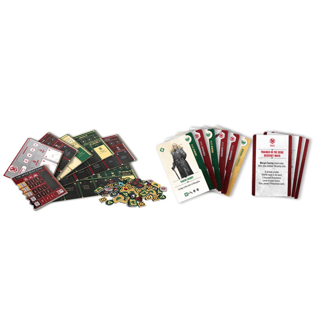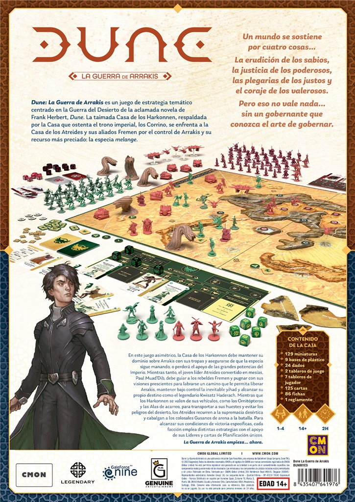 En este juego asimétrico, la Casa de los Harkonnen debe mantener su dominio sobre Arrakis con sus tropas y asegurarse de que la especia sigue manando, o perderá el apoyo de las grandes potencias del Imperio. Mientras tanto, el joven líder Atreides convertido en mesías, Paul Muad’Dib, debe guiar a los rebeldes Fremen y pugnar con sus visiones prescientes para labrarse un camino que le permita liberar Arrakis, mantener bajo control la inevitable yihad y alcanzar su propio destino como el legendario Kwisatz Haderach. Mientras que los Harkonnen se valen de sus vehículos, como los Ornitópteros y las Alas de acarreo, para transportar a sus huestes y evitar los peligros del desierto, los Atreides recurren a la supremacía desértica y cabalgan a los colosales Gusanos de arena a la batalla. Para alcanzar sus condiciones de victoria específicas, cada facción emplea distintas estrategias con el apoyo de sus Líderes y cartas de Planificación únicos. La Guerra de Arrakis empieza… ahora.