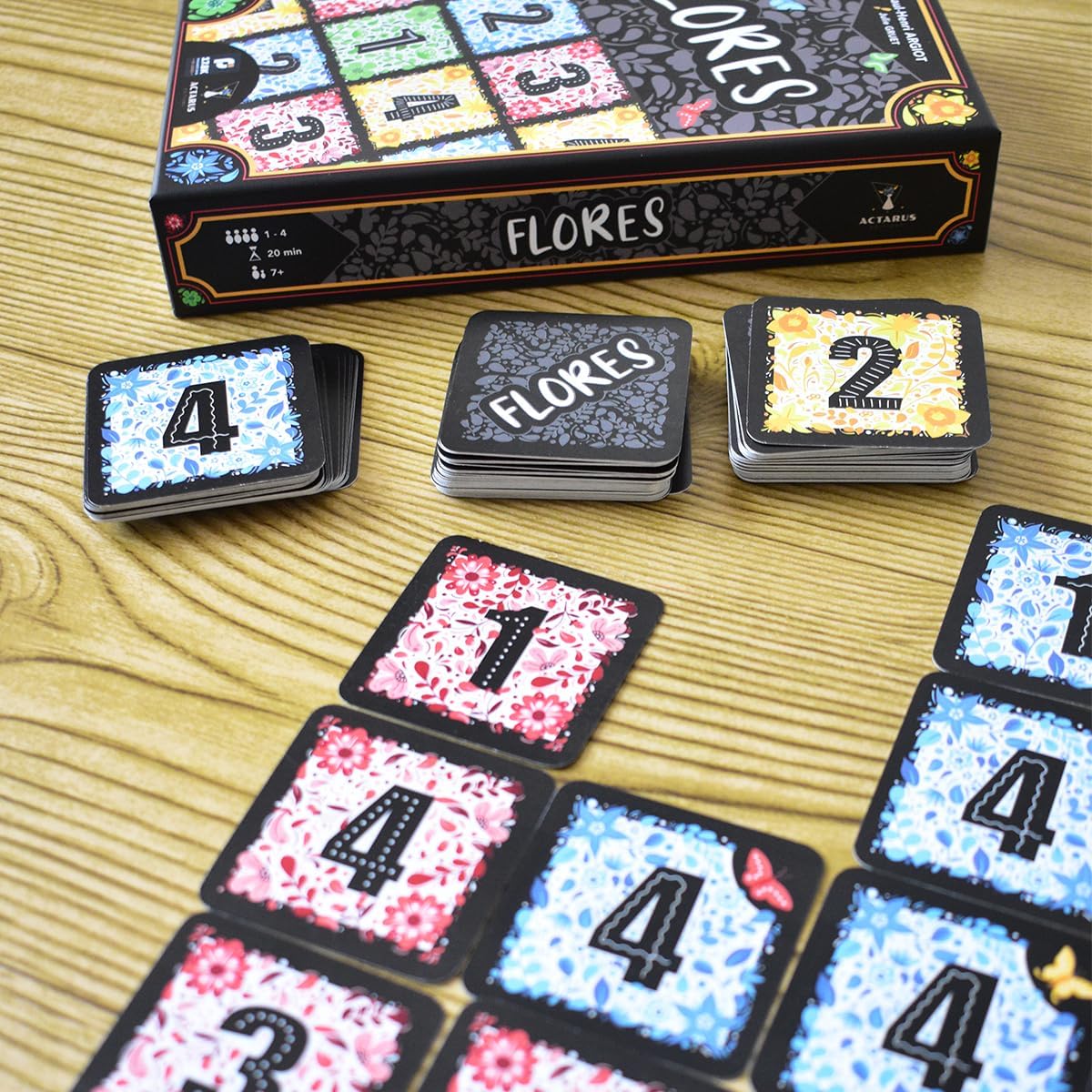 FLOWERS consta de una baraja de 108 cartas, con cuatro colores y valores del 1 al 4. Cada jugador comienza con una carta al azar en su área de juego, y las cartas restantes se dividen en pilas, una boca abajo y las demás con la carta superior boca arriba.