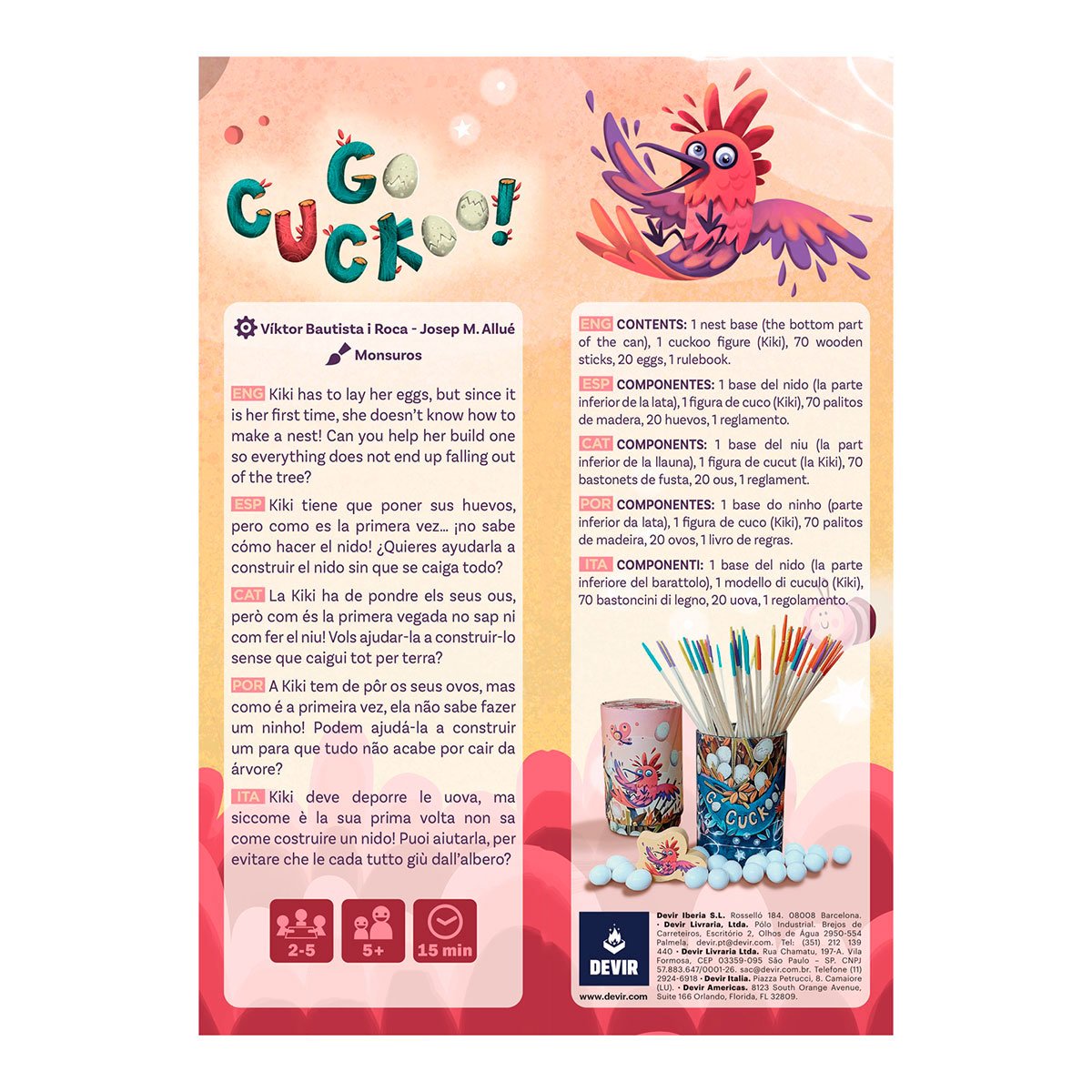 Todos los nidos están ocupados y el cuco Kuki no sabe dónde dejar sus huevos… ¿Podéis ayudarla a crear un hogar seguro para sus polluelos? En Go Cuckoo! deberéis construir un nido a partir de palitos y evitar que se caigan los preciados huevos. Diseñado por Josep María Allué y Viktor Bautista, este juego ganó el prestigioso premio As d’Or al mejor juego infantil en 2017. Las ilustraciones las firma Gabriela Silveira, responsable del arte de otros juegos como Fantasma Blitz. Una partida a Go Cuckoo! puede durar unos 15 minutos en partidas en las que pueden participar de 2 a 5 personas.