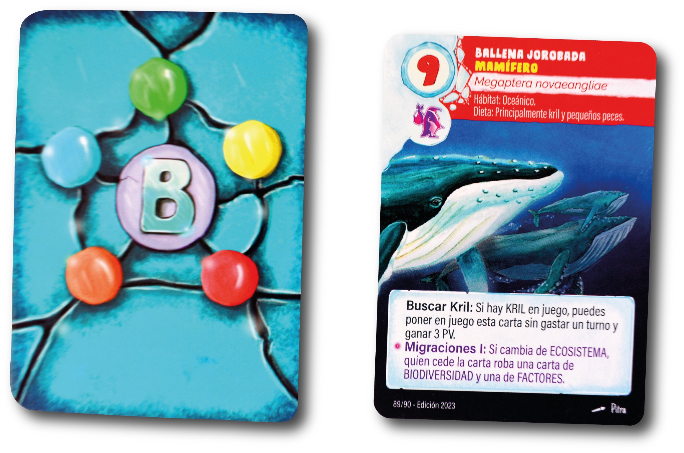 - Carta de Biodiversidad (Obligatorio): Estas cartas son el núcleo del juego, clasificadas por colores y números que representan diferentes tipos de especies y su posición en la cadena alimentaria.