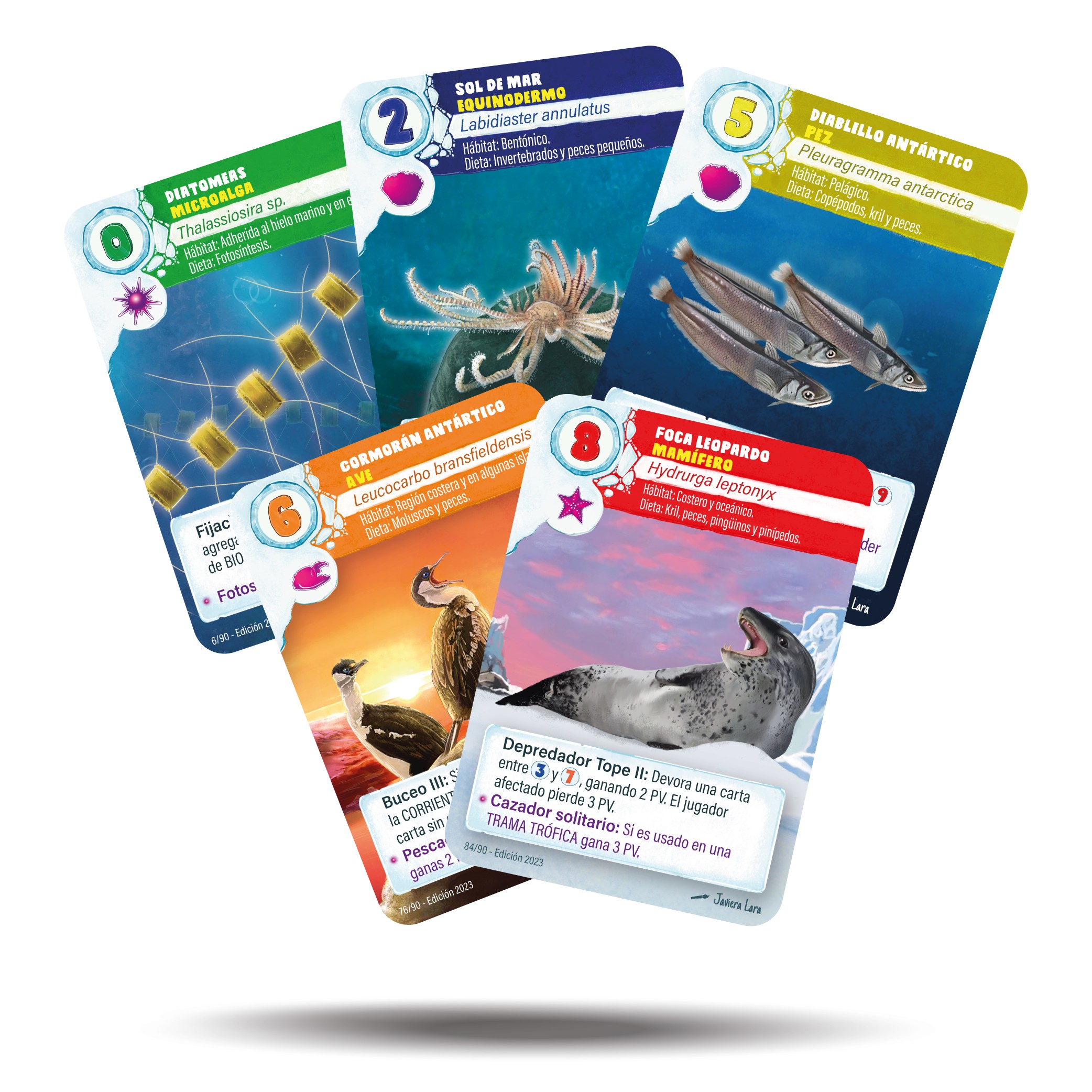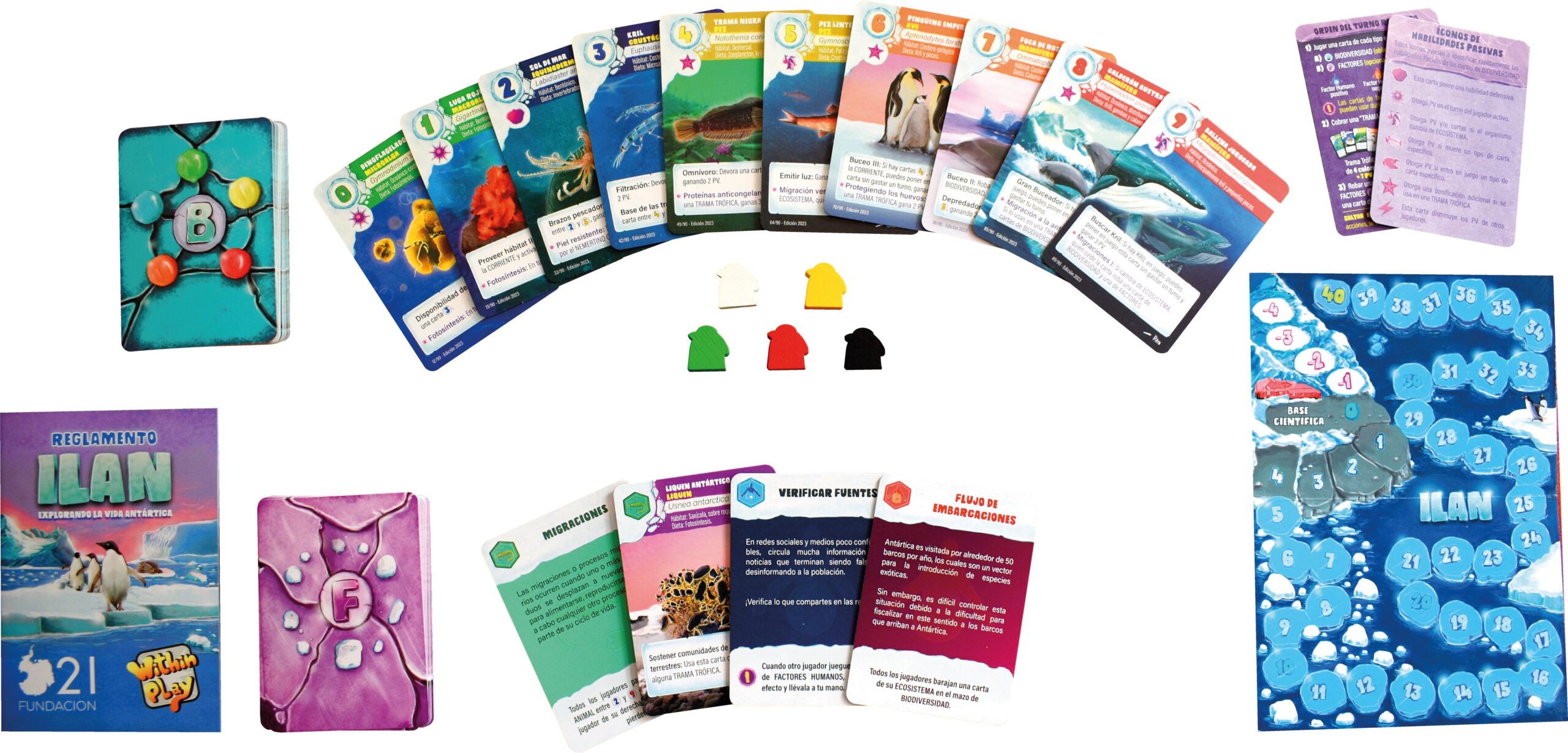 - Carta de Factores (Opcional): Estas cartas ofrecen una visión detallada de los factores que afectan el ecosistema antártico, permitiendo a los jugadores influir positiva o negativamente en el entorno.