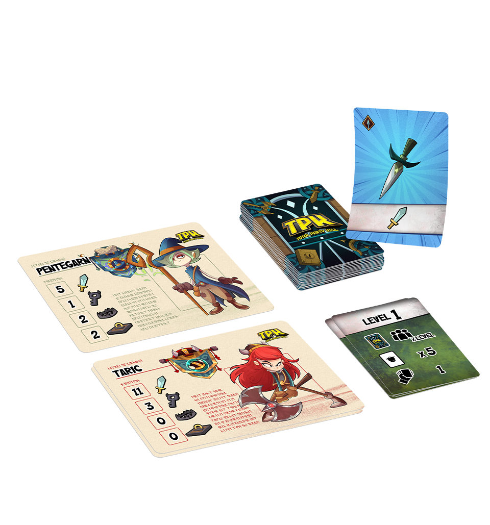 Componentes: Reglamento, 105 cartas de personaje, mazmorras, equipo, pociones y amenazas.