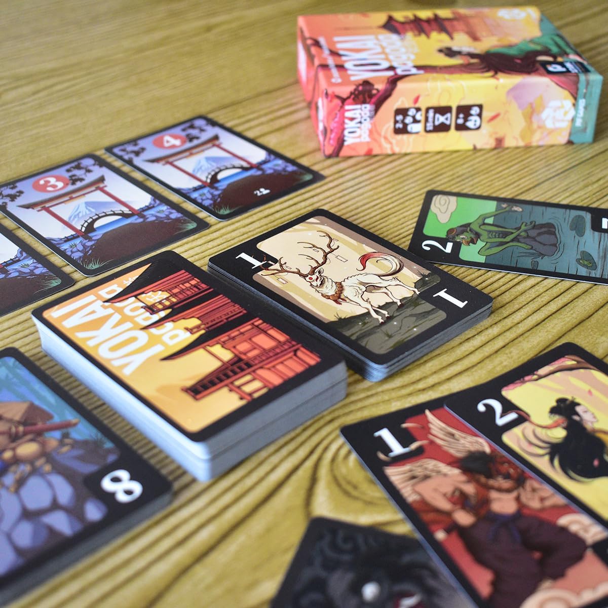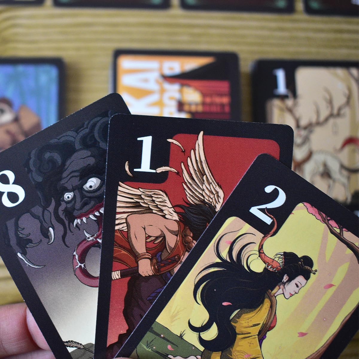 Si juegas con el mismo Yokai o el mismo número, puedes darle a alguien una carta de tu mano. Con un Yokai diferente y un número superior puedes coger una carta al azar del mazo o la primera carta boca arriba del montón de descarte contrario. Con un Yokai diferente y un número más bajo puedes seguir con la ronda como si nada hubiera pasado o terminar la ronda actual, pero sólo si tienes una cantidad total de tres o menos puntos en tus manos. Pero… ¡sólo debes tener en cuenta la carta más baja de cada tipo de Yokai que tengas!
